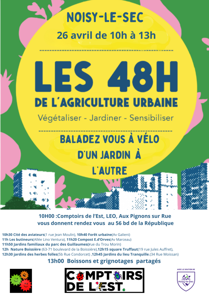 Il vous est proposé cette balade à vélo, issue d’un partenariat de « Les comptoirs de l’Est » et du « Laboratoire Zéro Déchet » « Le LE0 », dans le cadre des 48 heures de l’agriculture urbaine (Site officiel de l’événement et programme sur la France entière). Initiative soutenue par la ville de Noisy-le-Sec à laquelle se joint Aux Pignons Sur Rue et nous espérons un grand nombre de noiséen.ne.s. Nous serons accueilli.e.s au Lieu Tranquille pour le final.